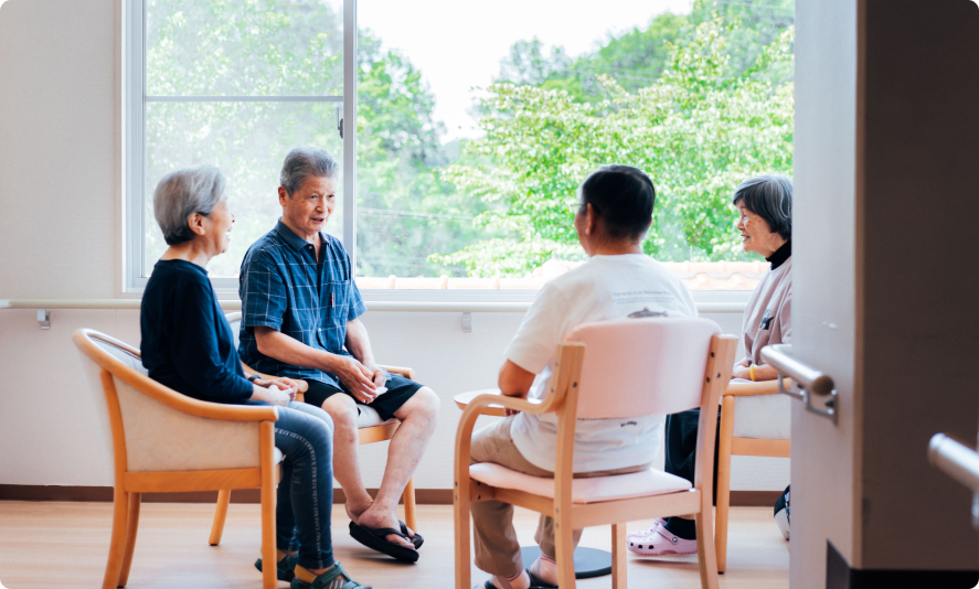 食堂や集いの部屋で、お茶やコーヒーを囲みながらおしゃべりタイム。